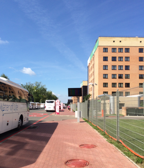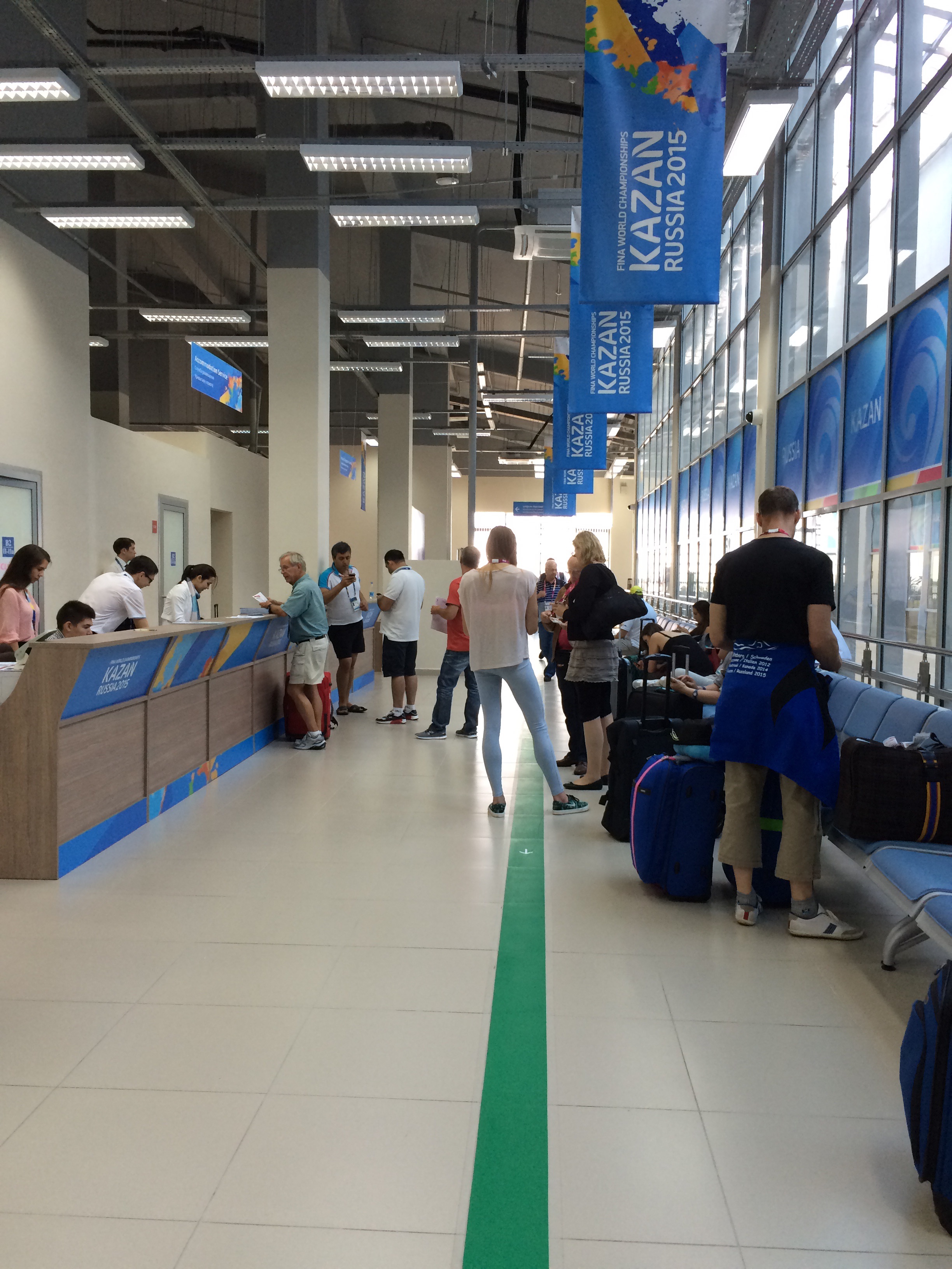 We were greeted at the baggage reclaim in Kazan by a team of Volunteers, (conscripted students) who were delightful and extremely helpful and efficiently herded everyone onto the waiting buses. 30 minutes later and after passing a rather severe security check we were deposited at the International Centre in the Athlete’s Gulag and instructed to follow a green line on the floor that led us to the first stage of accreditation.