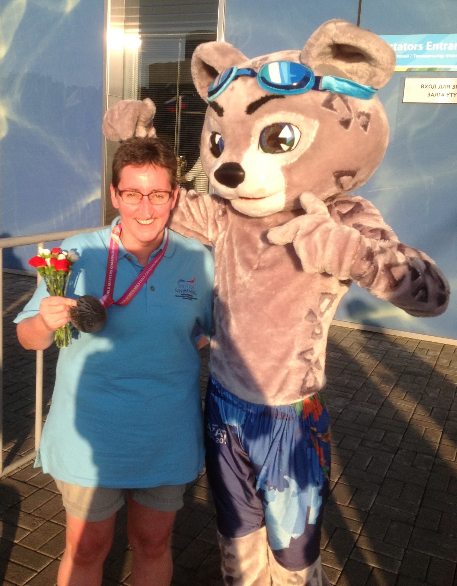 Anyway medal collected and after a brief entanglement with a furry snow leopard, who I understand is called Itil (I only have Amanda Heath’s word for this, she should know she asked him!)Lynne and I eventually escaped for dinner on Bauman Street, to celebrate with beer and the local delicacies duck pasties, aah I could almost be at home. Almost a good enough day to take my mind off the rapidly approaching death day…….200m breaststroke.